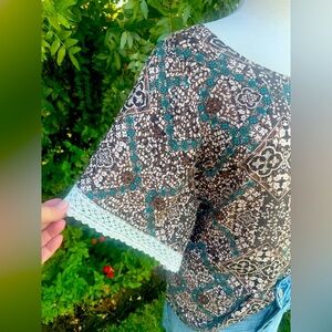 Chic blouse with intricate brown and teal patterns. Features elegant lace trim on sleeves. Ideal for casual wear.( pit2pit 24’ Length 24’ Approximately)