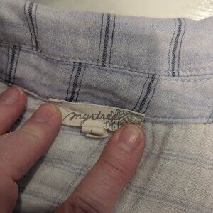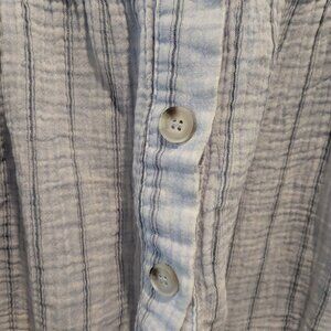 Lovely soft button up tunic with long button sleeves, collar, ragged hem and a drop waist. It could be worn as a tunic or a light jacket. Very comfortable! White and blue stripes and two button up pockets on the bodice.