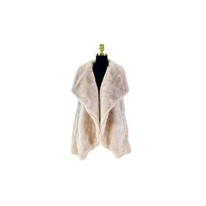 It features a soft tan faux fur shell with a smooth rayon lining and floral embroidery detail on the back for a feminine touch. The open-front drape design makes it ideal for layering over sweaters, blouses, or dresses. Both stylish and versatile, it’s a must-have addition to your fall and winter wardrobe.