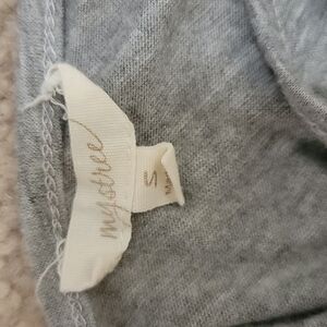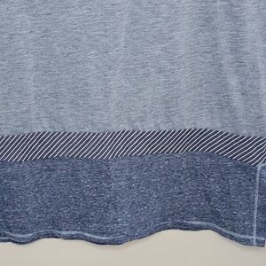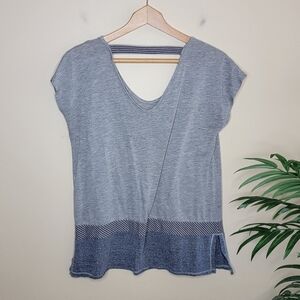 Unique heathered blue cap sleeve top with rounded v-neck and back cutout. Striped strap across the upper back. Contrasting hem.