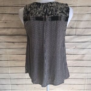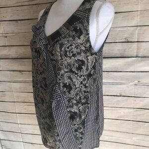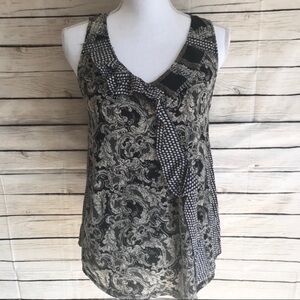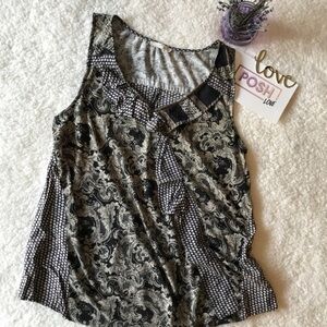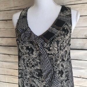 Fun and unique fabric blend with Ruffle neckline. A mix of multiple patterns give a fun twist on a classic top! EUC