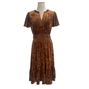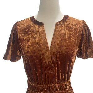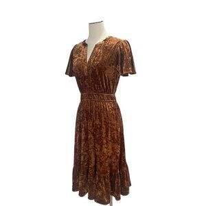 Crushed velvet dress, rust brown dress, Mystree clothing, autumn fashion, velvet midi dress, ruffled hem dress, winter dress, elegant casual dress, boho chic style, flutter sleeve dress