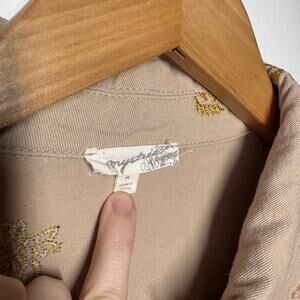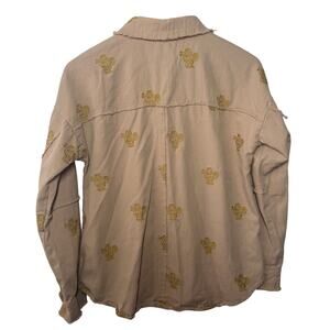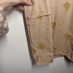 Mystree Shirt Women Size M Button Up Tan Gold Floral Embroidery Cotton Raw Seams