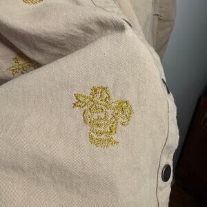 Mystree Shirt Women Size M Button Up Tan Gold Floral Embroidery 100% Cotton Raw Seams Snap Buttons