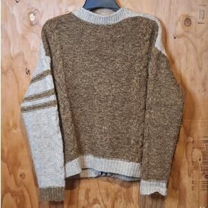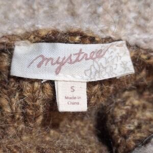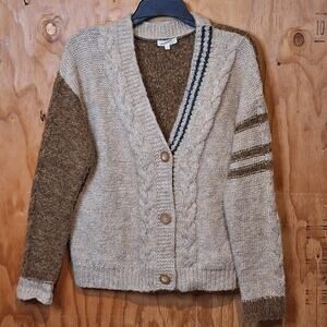 This cardigan sweater from Mystree is in excellent preowned condition - no flaws. Brown, Tan, Army Green Colorblock Pattern. 3 Large Button Closure. Polyester, Acrylic and Wool Blend. Size Small.