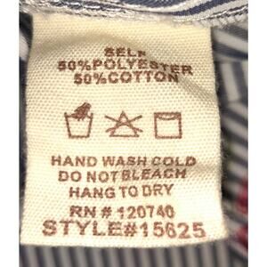 Women's SIZE S. Please check measurements as this seems to look larger than a small to me. 50% Polyester/50% Cotton. Hand Wash/Hang Dry. Made in China