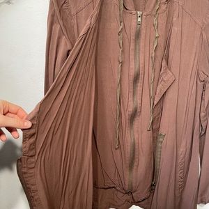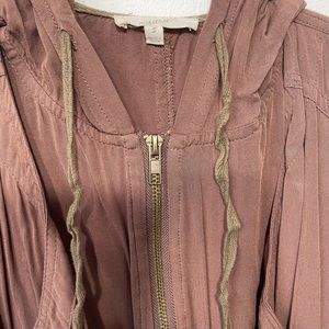 Lightweight mystree jacket in excellent used condition. Minimal/No signs of wear. No rips, tears or stains. Double zipper closure, side pockets, good, light brown color. Size small, 100% rayon