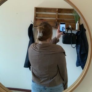 Super comfortable & soft. Zippers on the sleeve & has pockets.