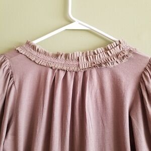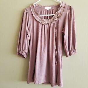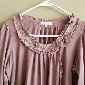 Mystree beige top you could wear to work or with Jean's. 100 % cotton super outrageous neckline. Made of ruffles and lace , but brings more to the occasion than looking dainty. A little side flower for for a extra touch with two strands of lace for you to tie or just leave hanging. A little sweet a little vintage. SZ L fits like a MED. A-30. A3002