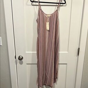 Elegant striped dress featuring a blend of pink and white hues. Perfect for casual outings or special occasions.