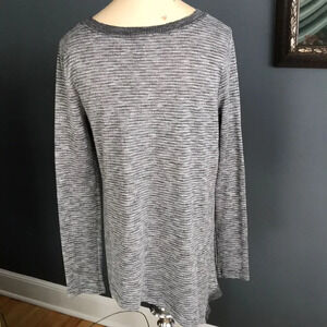 Mystree soft marled gray stretch knit top. Narrow black ridges. Darker marled ribbed neckline band and crossover hem. Crossover creates V at hem in front and back. Size small. Soft rayon/polyester blend. New, with tag. Nonsmoking home.