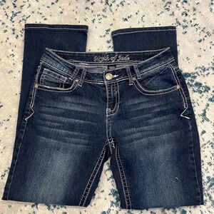 Myth of Jade Dark Wash Boot Cut straight leg white stitching pocket detail 28