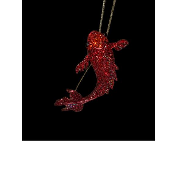 Round Red, Orange, Iridescent, and Black Austrian Crystal, Gold-Tone & Red Enamel Koi Fish Brooch or Pendant. Comes with a .375" bail and 1.5" pinstem. Chain not included.