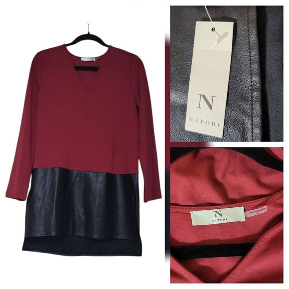 Natori Womens Tunic- Dress Colorblock Knit- Faux Leather Trim- Long Sleeve size S NWT