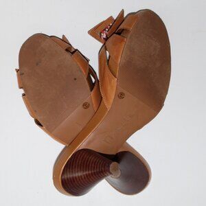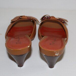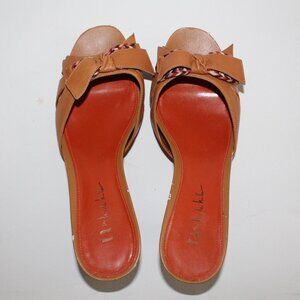 These classy caramel-colored flats from N by Nicole Miller feature a stylish bow on top and a low heel for just a touch of lift. They're in good used condition with very good soles and only light signs of wear (see photos).