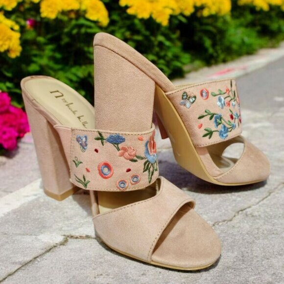 These N by Nicole Miller sandals bloom w/ intricate floral embroidery across a soft beige textile upper ✦ open-toe design & chunky 4" heel strike the perfect balance between comfort & sophistication ✦ subtle stretch panel ensures an easy, secure fit.