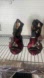 Stunning burgundy satin heels adorned with sparkling embellishments. Features elegant black ribbon ties for a chic look.