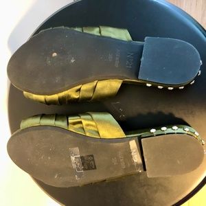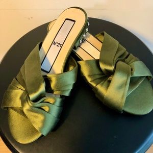 These gorgeous military green satin slide sandals dress up any outfit.