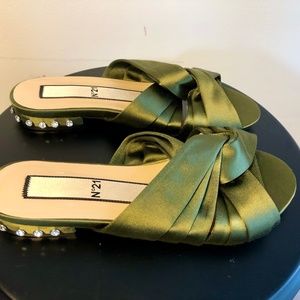 No.21 (Numero Ventuno) Military Green Satin Signature Knot Crystal Slide Sandals