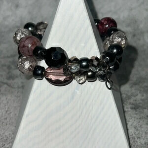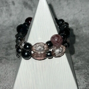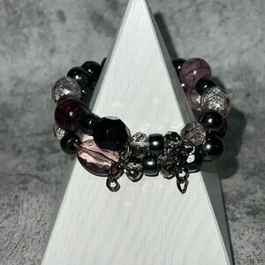 THIS LISTING IS FOR THE MODERN LUCITE BEADED STRETCHY BRACELET. THE COLORS ARE PURPLE, SILVER, BLACK, AND SMOKY. IT IS 80mm ON INSIDE OF BRACELET.