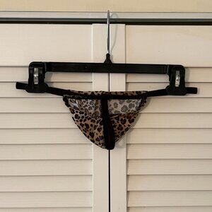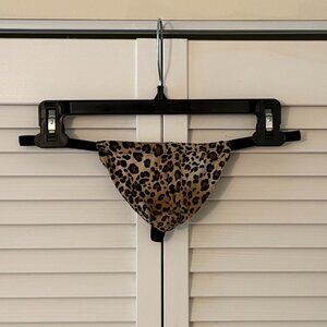 N2N G-string in leopard print. Pouch can be adjusted to increase or decrease pouch width. 95% Polyester, 5% Spandex.