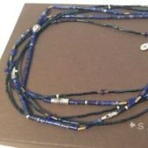 Brass, Lapis, Quartzite, sterling silver. It is 18-20 inches long. In new condition.