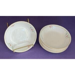 This exquisite six-piece Noritake fruit dessert sauce bowl set from 1918 features a beautiful N41 pattern of pink roses, blue triangles, a green leaf border, and gold trim. The delicate porcelain bowls are perfect for any occasion and are stackable for easy storage. They are all in their original condition and have the Noritake backstamp painted on them.
