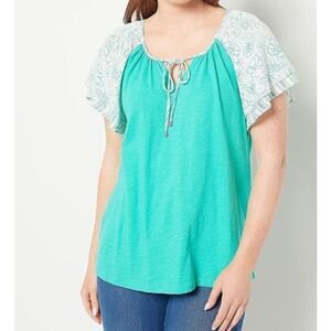 Fabrication: slub knit body, woven printed flutter sleeves with striped edges, woven tie necklineFeatures: gathered V-notch neckline, straight bottom hemFit: semi-fitted; follows the lines of the body with added wearing easeLength: missy length 25-1/2" to 27-5/8"; plus length 28" to 31-1/2"Content: knit 100% cotton; woven 100% polyesterCare: machine wash, tumble dryitems are