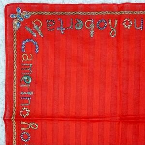 Bright red scarf with colorful embroidery. Features brand name in intricate design.