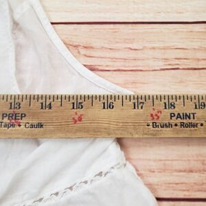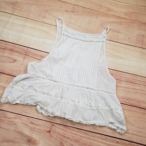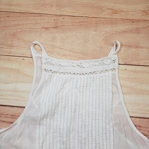 Lightweight cotton gauze tank top features delicate pintuck pleating across the bodice and intricate crochet lace trim throughout the tiered, ruffled hem. Designed with a high halter-style neckline and thin spaghetti straps, this airy piece offers a relaxed, flowy silhouette perfect for warm weather. The semi-sheer fabric and open-work lace details provide a romantic, bohemian aesthetic.