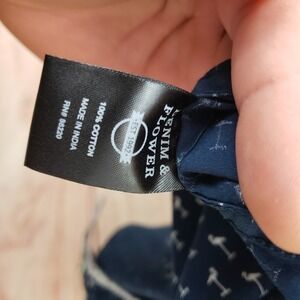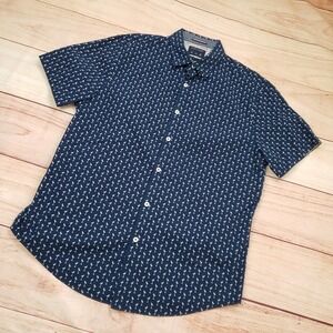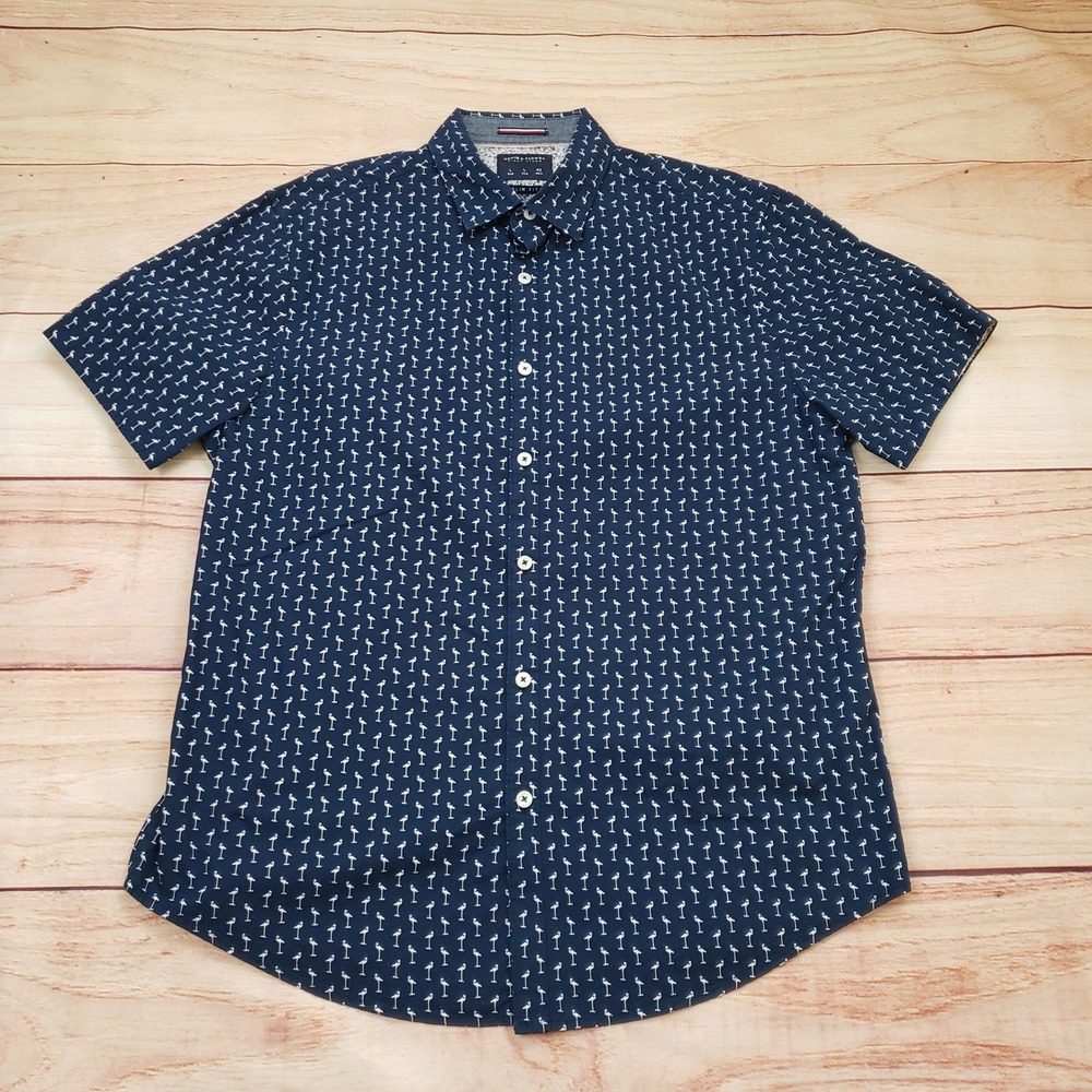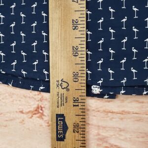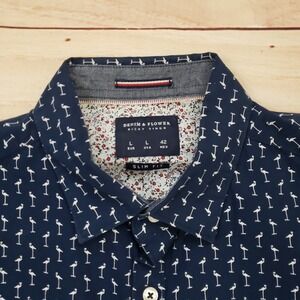 Short sleeve button-down shirt features a crisp navy blue base adorned with a repeating white flamingo print for a playful, summery look. Crafted from 100% cotton, this slim-fit top includes a classic pointed collar and a contrasting floral inner yoke detail. The lightweight fabric and casual aesthetic make it an ideal choice for tropical vacations, beach outings, or weekend brunch.