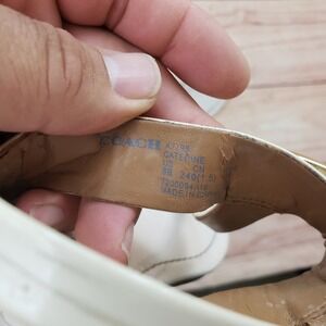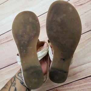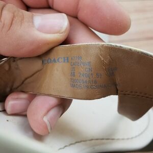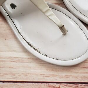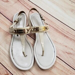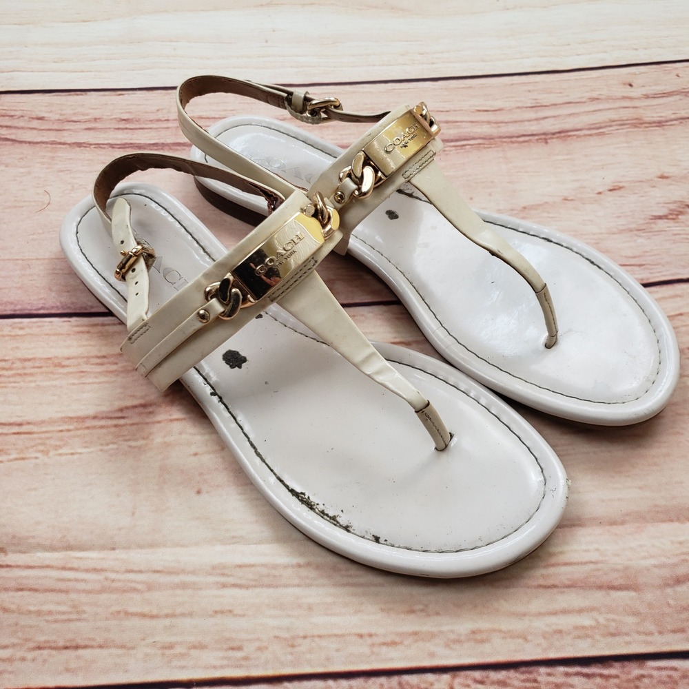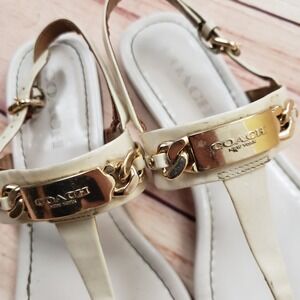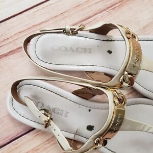 Keywords: COACH, New York, Sandals, Thong Sandals, White Sandals, Leather Sandals, Chain Detail, Gold Accent, Summer Shoes, Women's Shoes, Designer Sandals, Casual Sandals, Size 8, Elegant Sandals