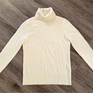 Elegant cream turtleneck sweater. Soft ribbed texture. Perfect for layering.