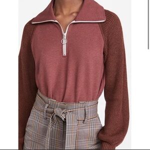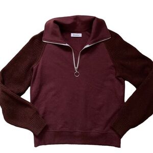 This Elevated mid-weight fleece top in a merlot red is perfect for brunch or dinner with your social circle. It offers a classy and chic update on the sweatshirt trend thanks to the contrasting knit sleeves.