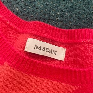 Vibrant crew neck sweater with bold red and pink pattern. Short sleeves. Soft and stylish.