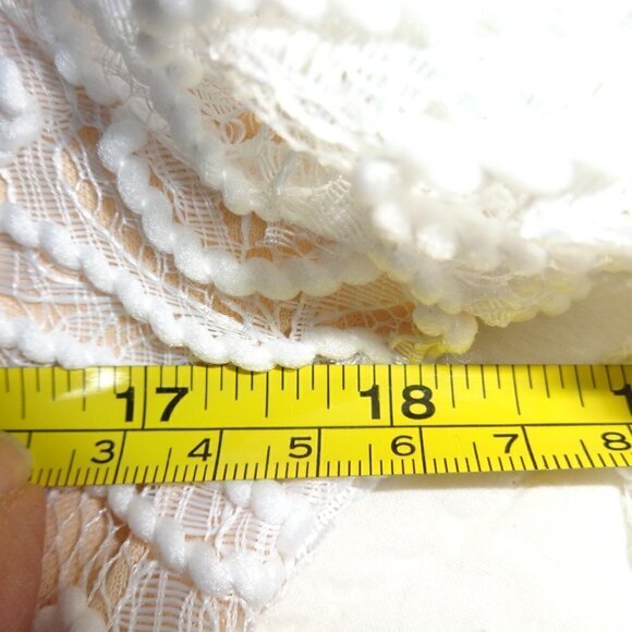with elastic, full back zipper, V neck, the lace cording weave is very soft, 17" across the front arm pit to arm pit,