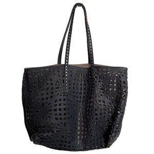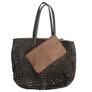 Nada Sawaya New York Laser Cut Handbag: Beautiful leather handbag features a open laser cut design, decorative silver grommets on the straps, removable zipper pouch.