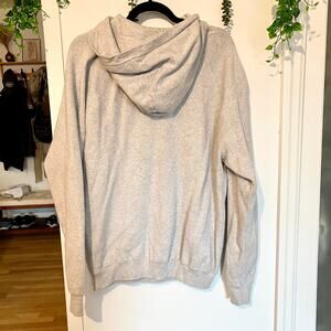 This sweater is thick and warm, has a slouchy fit and silhouette. Drop shoulders and a front pocket keep it classic, while a lack of drawstrings makes for a more polished vibe.