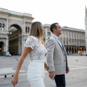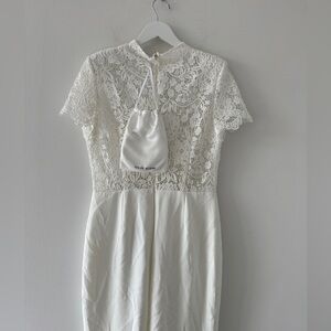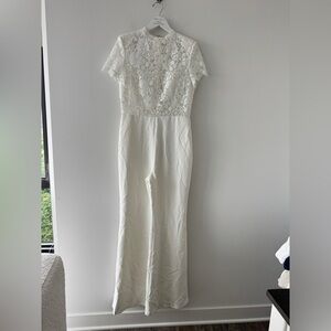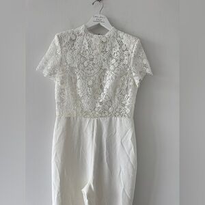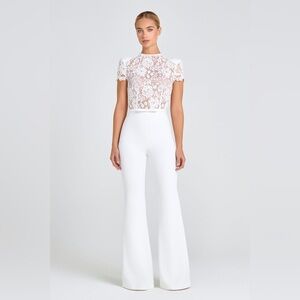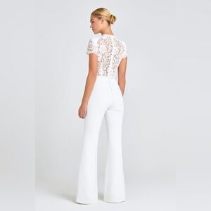 Exude timeless sophistication with the HATTIE White Jumpsuit. This high-neck, short-sleeve jumpsuit features a lace bodice that features a subtle hint of skin, paired with our signature lined crepe flared trousers for an effortlessly chic look. Finished with a detachable crepe bow belt, HATTIE is the one piece wonder you need in your wardrobe this season.