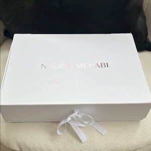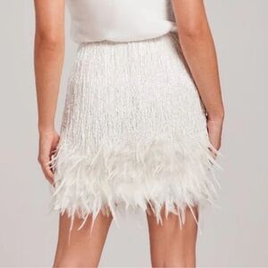 Stunning intricately beaded white skirt by Nadine Merabi with feathers. Size Medium. Excellent condition, one small makeup stain on inside of waist band shown otherwise no flaws. Comes with box.