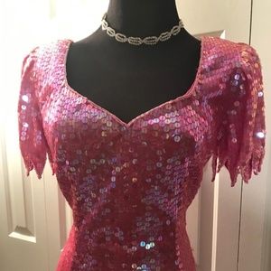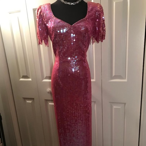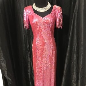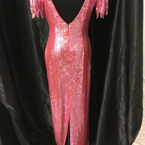 fully beaded gown scallop sleeve slit in back - color fuschia pink (few loose beads)