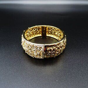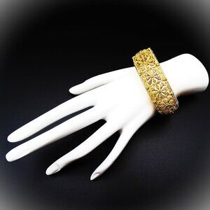 Stunning and sparkling yellow gold plated and clear cubic zirconia hinged bangle bracelet is 7/8" wide, 6.75" long with box (push down) clasp.