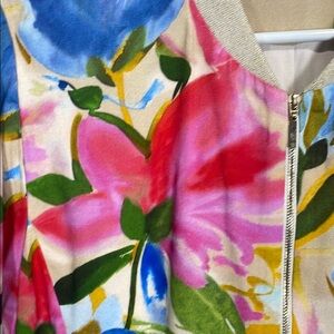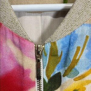 Bomber jacket watercolor flowers hot pink baby blue royal cobalt blue green leaves painting museum fall