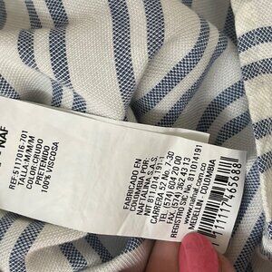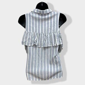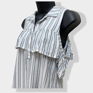 Naf Naf blue and white striped collared ruffle off shoulder top with buttons