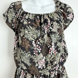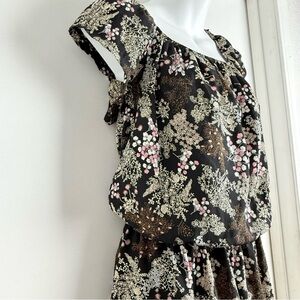 Elegant black dress with delicate pink and white floral patterns. Ideal for stylish outings.