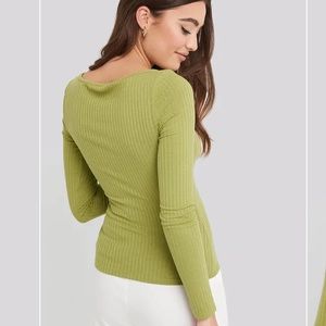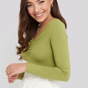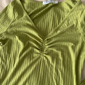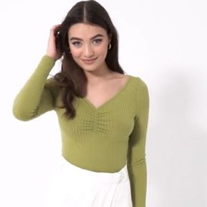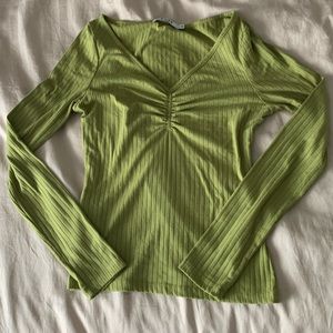 Soft, green ribbed knit v-neck top with ruching in front. Worn 3 times and in great condition. Sold out on site. Size small, 36 or 4.