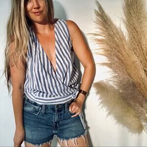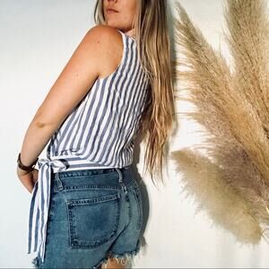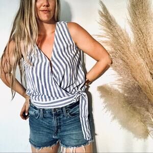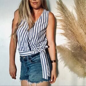 NAKED ZEBRA Blue White Striped Wrap Tank Top Waist Bow Tie VNeck Blouse Shirt M