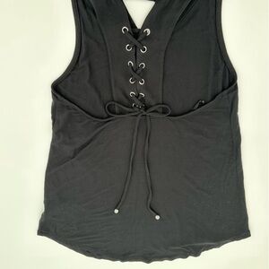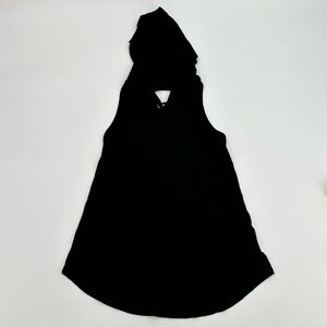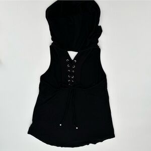 Black, sleeveless, hooded, lace up back
