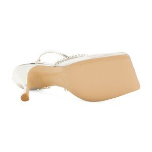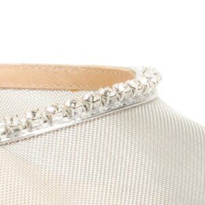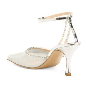mesh construction, flared heel, chain link detail, jewel embellished trim