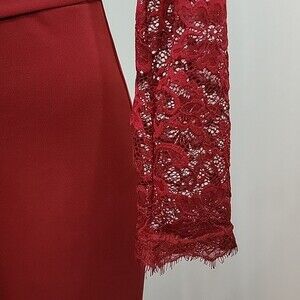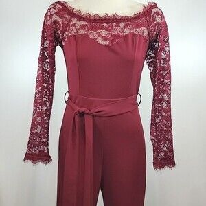 Pre-owned Nanamacs red lace trim jumpsuit size large. Sweetheart neckline with lace trim above. Zip up back closure with tie at waist and flare legs.